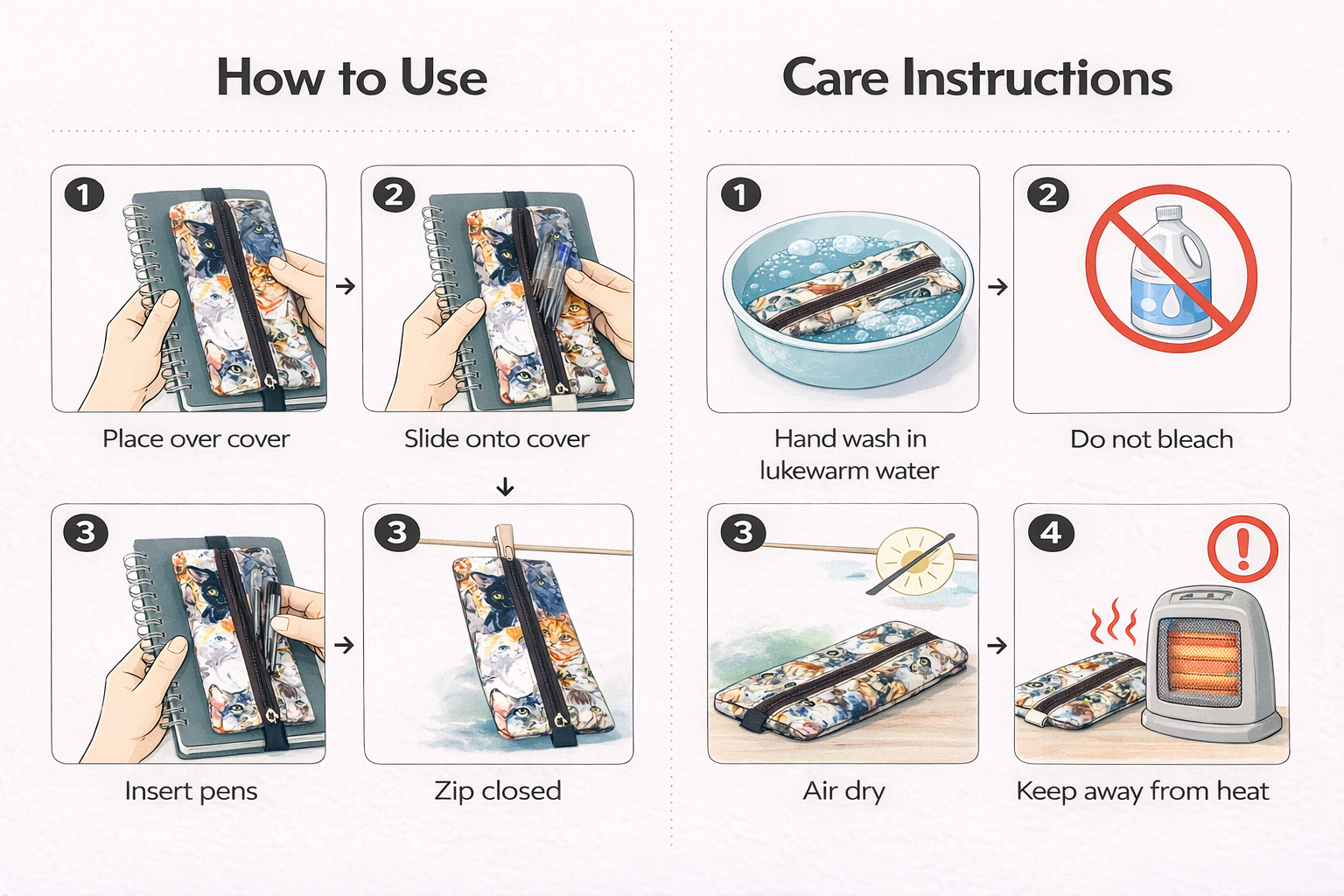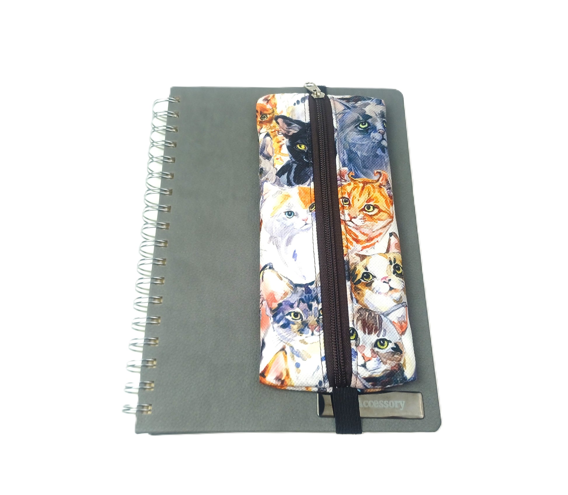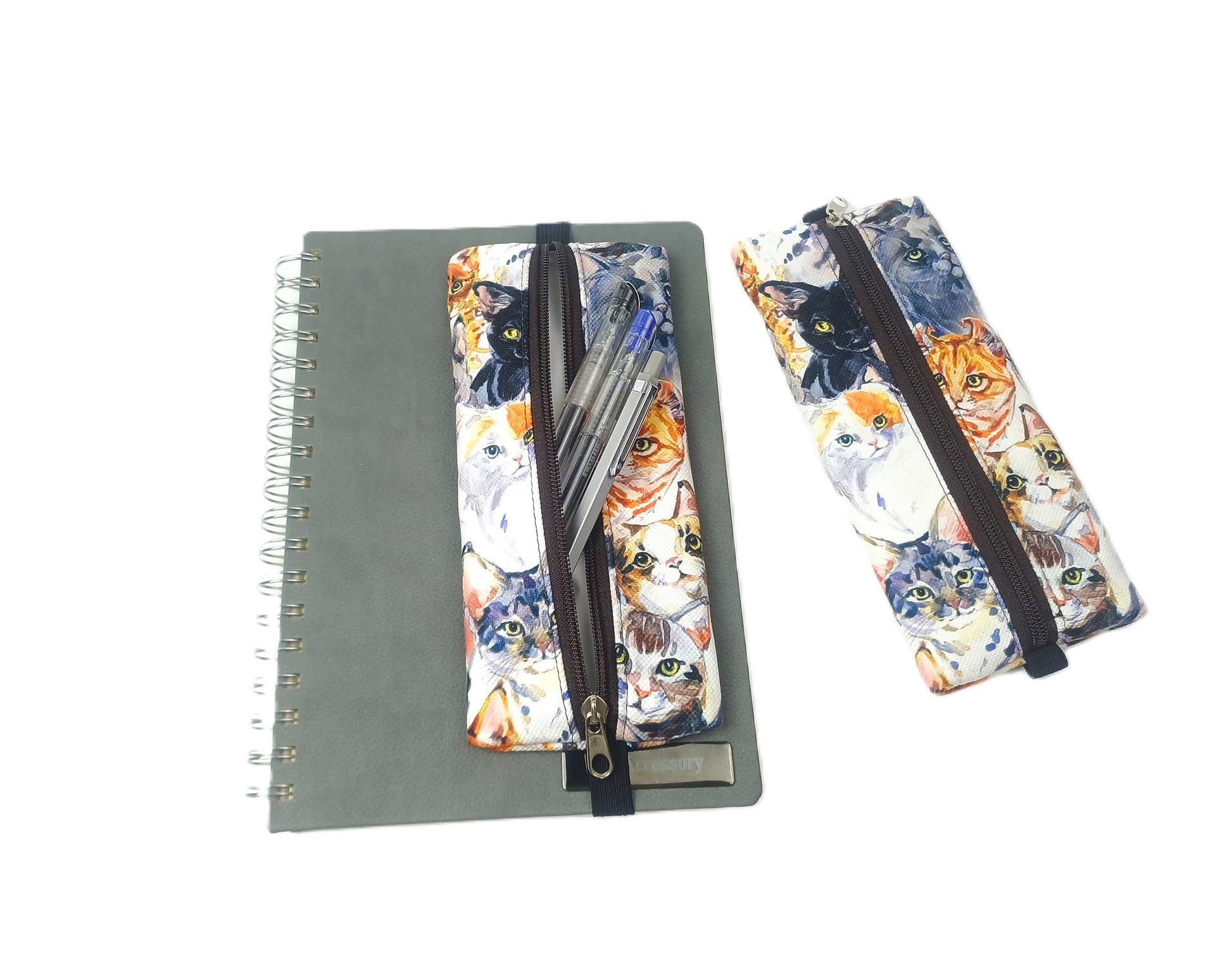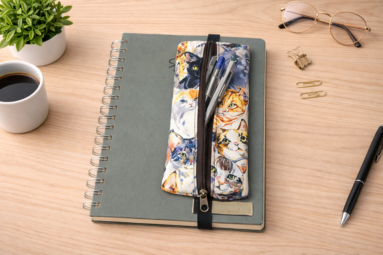 Kedi Desenli Lastikli Defter Üstü Kalemlik, canlı renkleri ve dijital baskılı pamuk kumaşıyla eğlenceli ve özgün bir tasarım sunar. Kedi figürlü desenleri sayesinde özellikle hayvan severler için dikkat çekici bir aksesuardır.