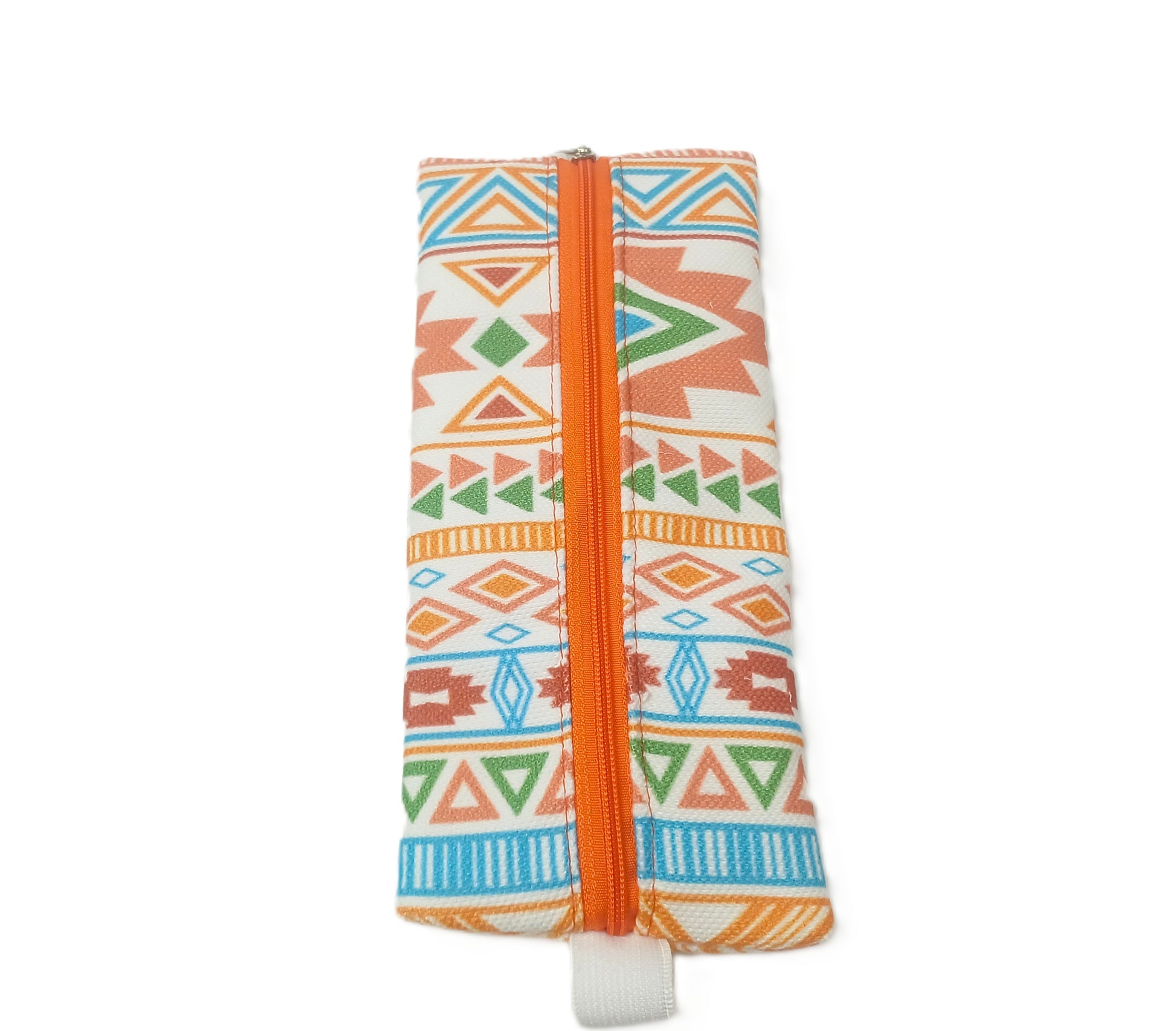 Turuncu etnik desenli defter üstü kalemlik, canlı renkleri ve geometrik desenleriyle dikkat çeken pratik bir kırtasiye ürünüdür. Dijital baskı tekniğiyle üretilmiş kumaşı sayesinde desenler net, renkler canlıdır.