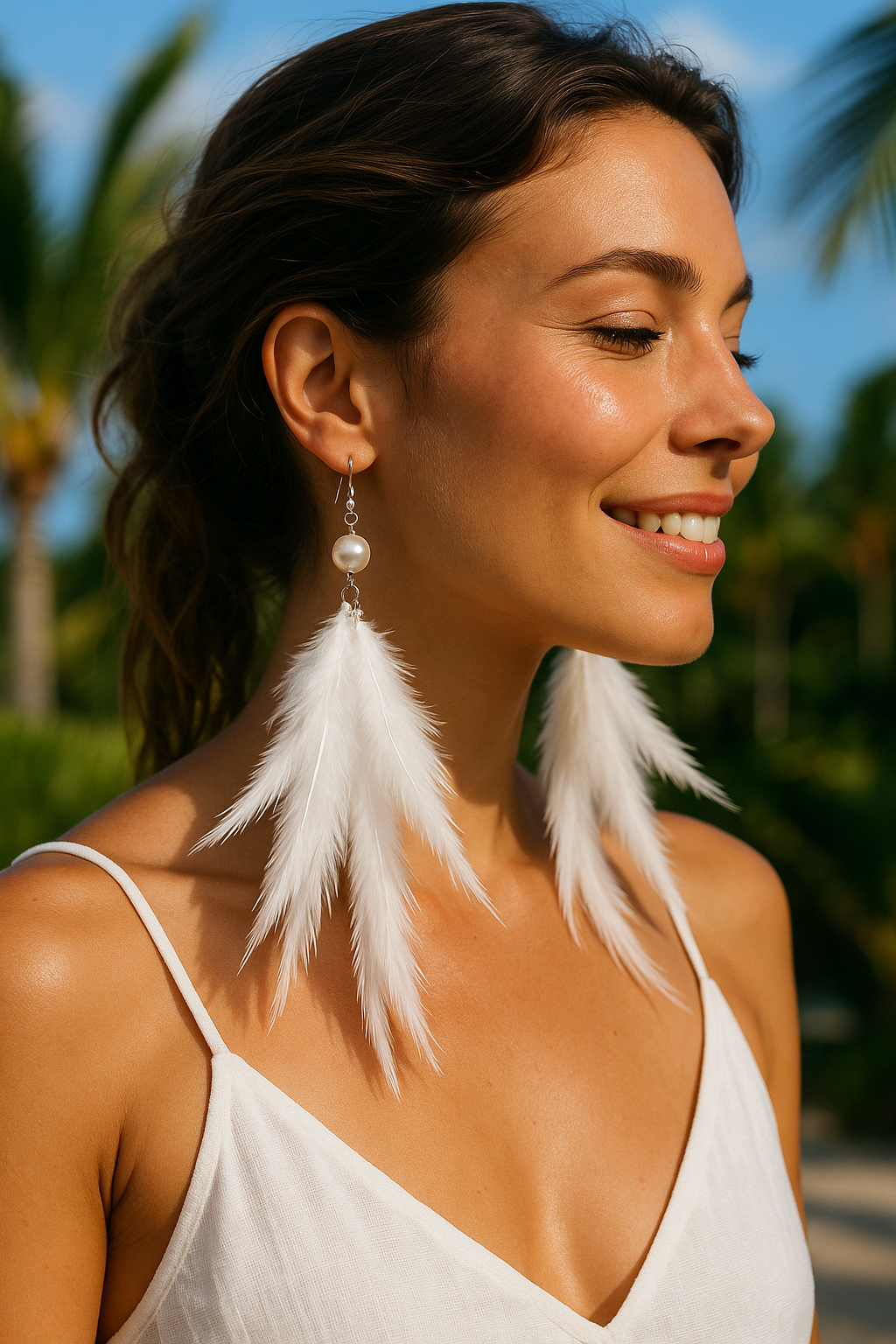 Zarif ve sade görünümüyle öne çıkan beyaz tüy detaylı küpe, minimal ama dikkat çekici bir stil sunar.