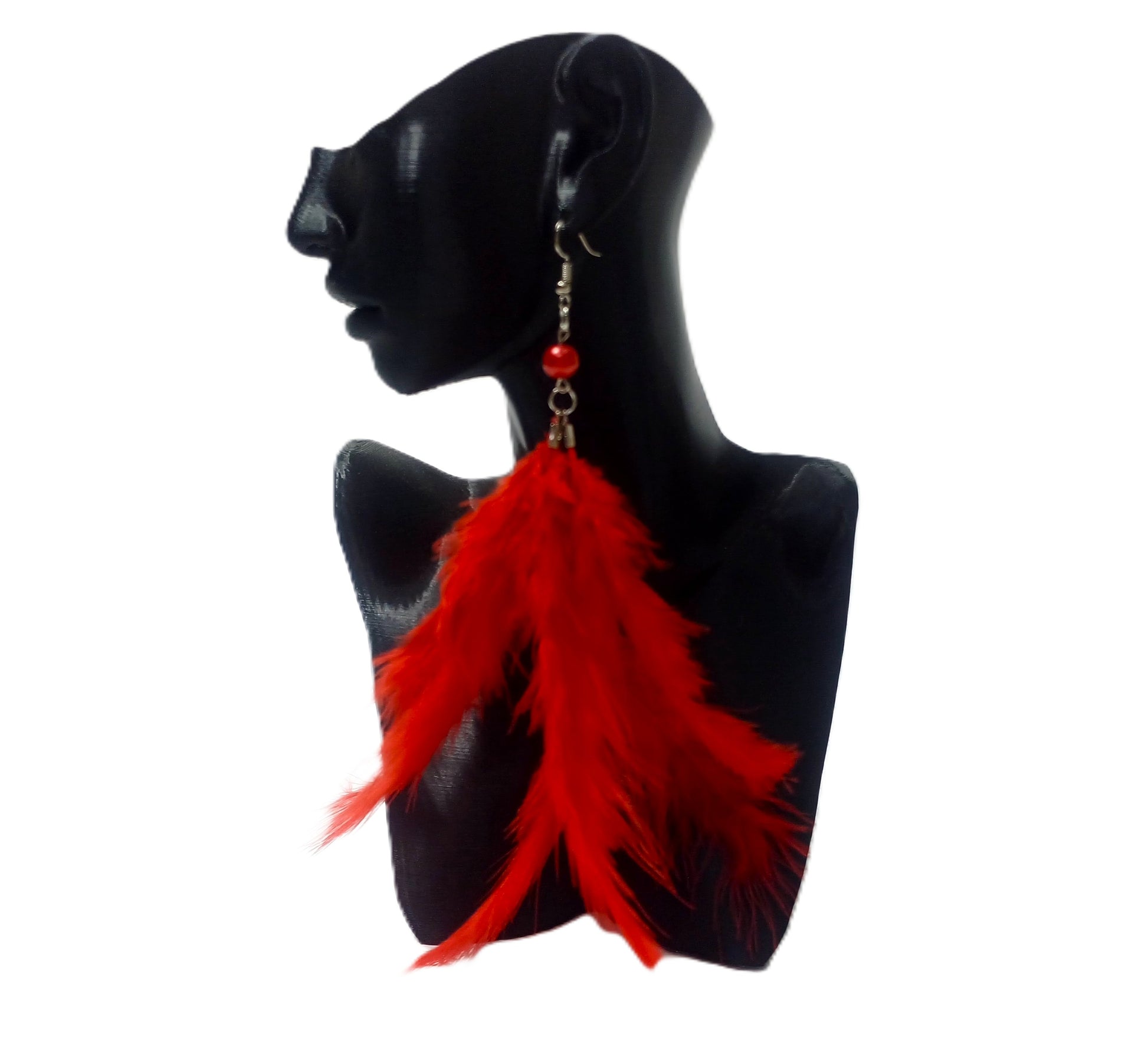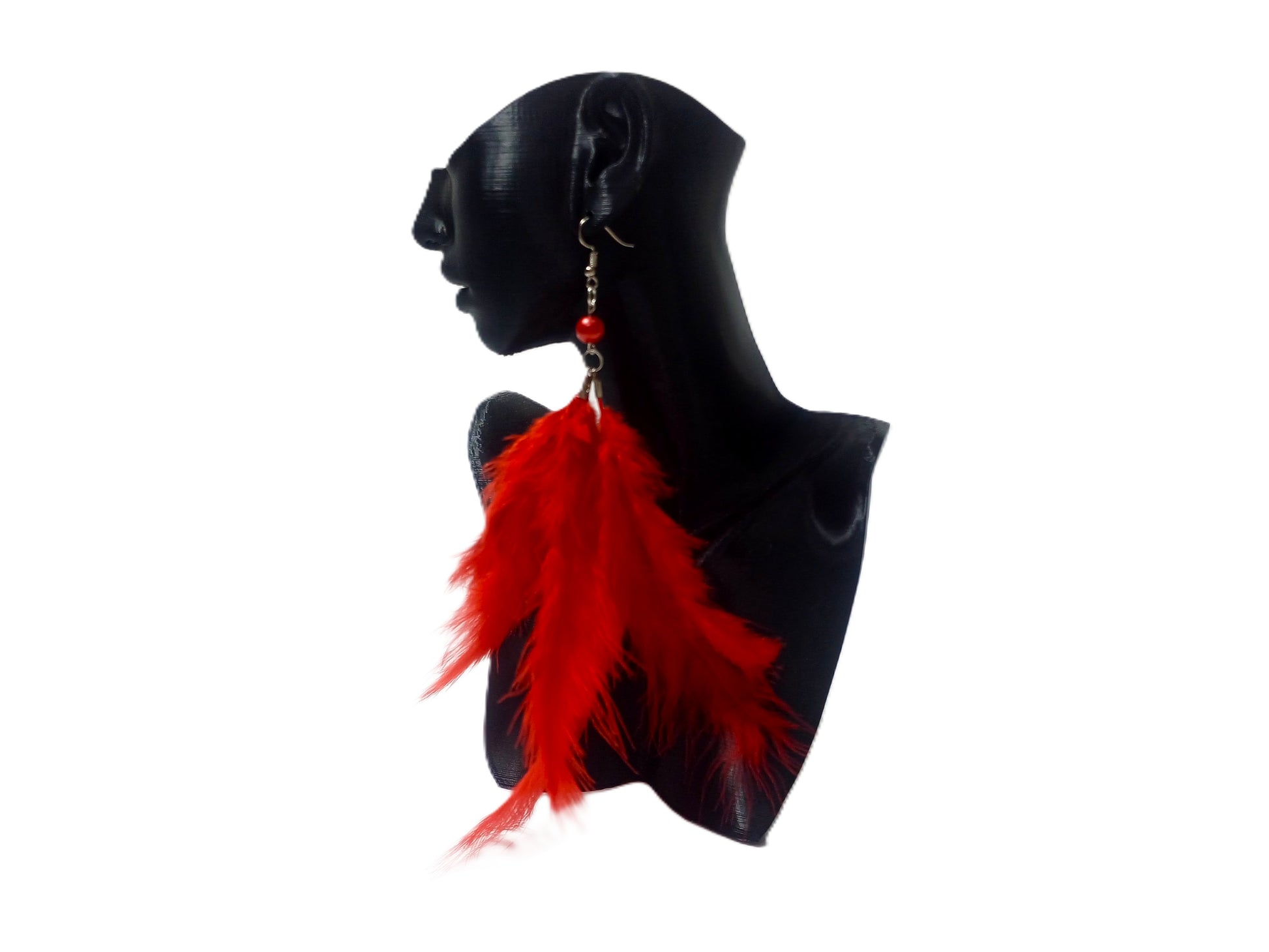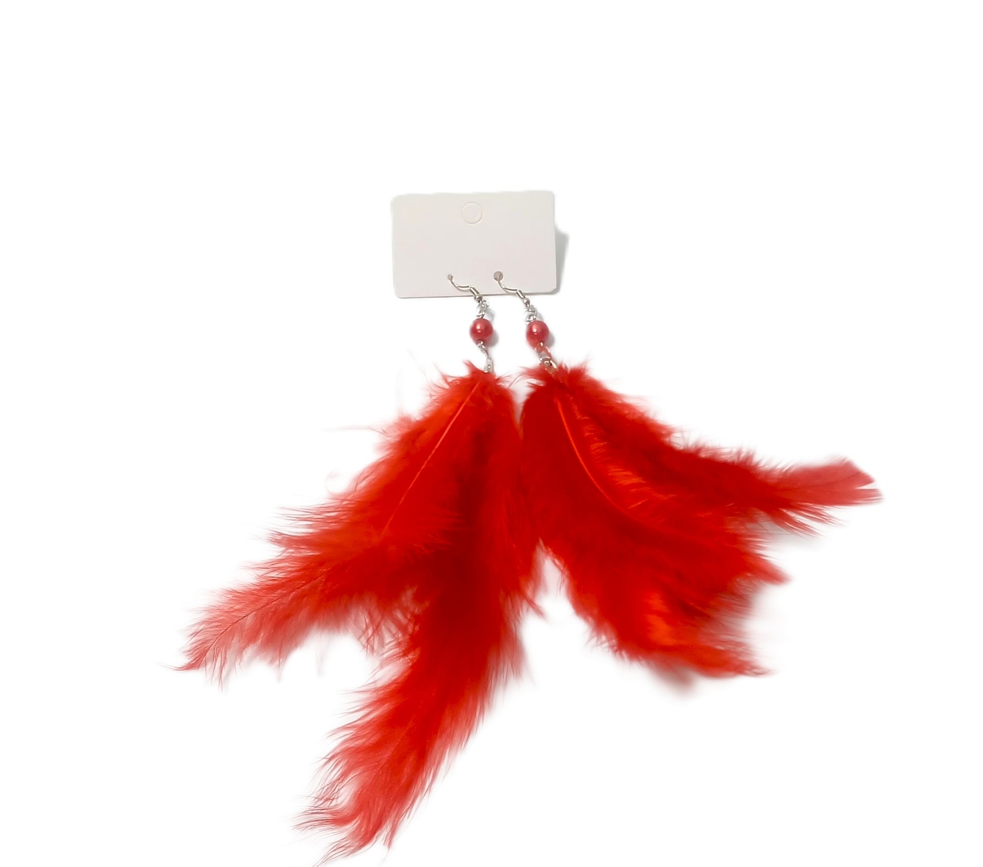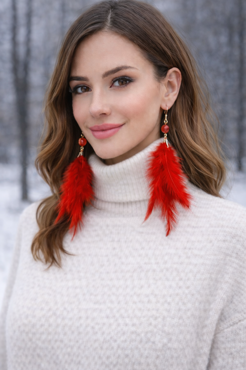Canlı ve iddialı duruşuyla öne çıkan kırmızı tüy detaylı küpe, stiline güçlü bir vurgu katmak isteyenler için tasarlanmıştır.